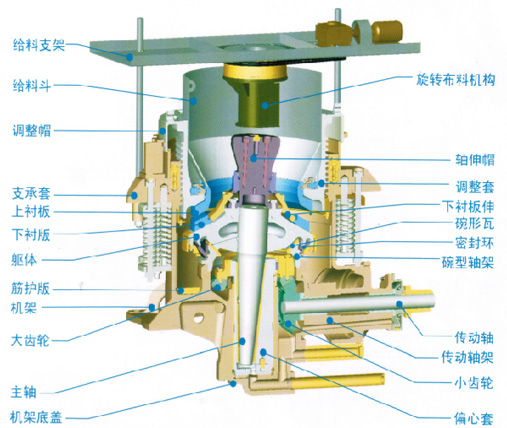 旋盤式破碎機不用于圓錐破碎機。一般圓錐破碎機都是采用破碎執(zhí)行部件直接擠壓物料的破碎。旋盤式破碎機采用的則是“層壓破碎”,就是將破碎機的破碎執(zhí)行部件對物料的擠壓與沖擊作用轉變?yōu)槎鄬游锪狭W娱g相互沖擊與研磨的綜合作用,從而實現(xiàn)物料破碎。
